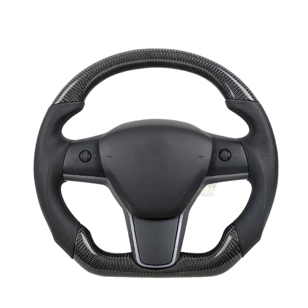 Tesla Model Y Delikli Deri Detaylı, Orta Panel ve Yan Panel Mat Karbon Fiber Siyah Kaplama, Direksiyon Simidi